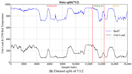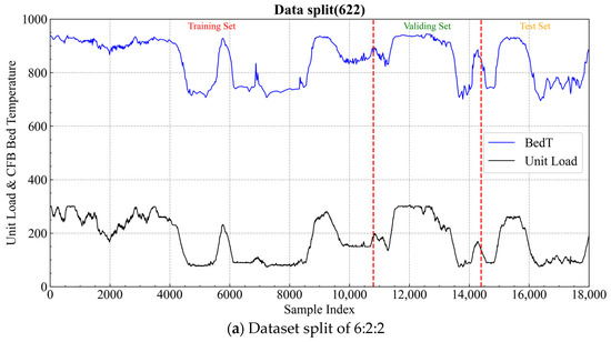 In Figure 13, the unit load refers to the power supply load of the CFB thermal power plant, which determines the boiler’s operating conditions. As shown in the figure, the dataset used in this study includes various operating scenarios, such as increasing load, decreasing load, and steady load conditions. Therefore, the data in this study can be used to validate the bed temperature prediction performance under different operating conditions. To validate the performance of the proposed prediction model, the experimental dataset is divided into training, validation, and testing sets in the ratios. If the size of the training set decreases and the model’s performance significantly deteriorates, this indicates that the model achieves high prediction accuracy only for the training data, while its generalization ability remains weak. Therefore, to investigate the impact of training data volume on the model’s generalization ability, we studied two dataset split ratios: 7:1:2 and 6:2:2 for training, validation, and testing, respectively. The 7:1:2 split, or even higher training data ratios, is a commonly adopted data partitioning method. Based on this (dataset split ratio 7:1:2), we further explored the model’s generalization ability under a lower training data ratio of 6:2:2.