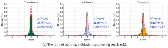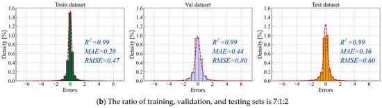 The impact of different training dataset lengths on model prediction performance is compared. Figure 14 shows the distribution of prediction errors under these two dataset splits. The results indicate that the different dataset splits have a minimal impact on prediction errors. Regardless of the dataset splits, the model’s performance across the training, validation, and testing sets remains consistent, which demonstrates the model has a strong stability and an excellent generalization ability. It is evident in Figure 14 that the proposed iTransformer model performs exceptionally well under both dataset splits, achieving an R2 value of 0.99. This confirms that the model has a strong ability to capture the trends and dependencies of the input features independent of the changes in the dataset splits.