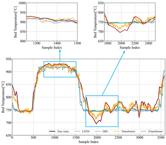 The proposed iTransformer-based model was comprehensively evaluated on its generalization ability and single-step and multi-step prediction accuracies under different training, validation, and testing datasets. It was also compared with other models such as GRU, LSTM, and Transformer. These evaluations highlight the effectiveness of the iTransformer model in predicting bed temperature dynamics with improved accuracy and robustness.