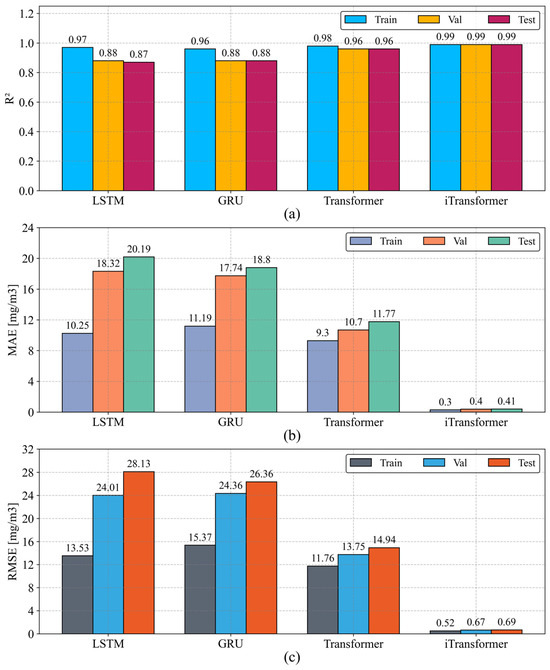 The performance of the models was evaluated based on three metrics: R2, MAE, and RMSE. The results are shown in Figure 16. The iTransformer model demonstrates excellent predictive performance, achieving R2 values of 0.99 across the training, validation, and testing sets. iTransformer significantly outperforms the comparative models LSTM (0.97, 0.88, 0.87) and GRU (0.96, 0.88, 0.88) and surpasses the Transformer model with the same architecture (0.98, 0.96, 0.96).