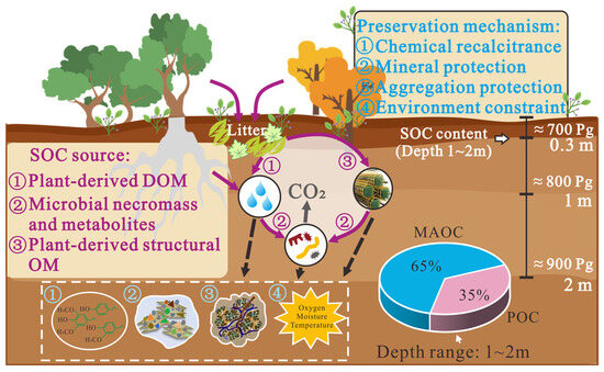 As a dynamic global carbon reservoir, soil contains more organic carbon than vegetation and the atmosphere [1]. The estimated global stock of soil organic carbon (SOC) ranges from 1500 to 1600 Pg (Pg = 1015 g) at a soil depth of 1 m, and from 2376 to 2456 Pg at a depth of 2 m [2] (Figure 1). The release or activation of even a small fraction of SOC can significantly impact atmospheric greenhouse gases and global climate. Approximately 14% of the atmospheric CO2 increase in the last decade has been reported to be attributed to SOC instability [3]. However, the combination of soil minerals with organic matter can effectively prevent the decomposition of organic matter. Soil minerals are a crucial component of soil carbon stocks, accounting for more than 60% of the total [4]. Particulate organic carbon (POC) primarily originates from partially decomposed plant residues and represents a relatively unstable organic carbon component. In contrast, mineral-associated organic carbon (MAOC) is mainly formed from recalcitrant microbial metabolites and residues, characterized by slow turnover and excellent stability [5]. Therefore, studying the stability of SOC from the perspective of soil minerals is of great significance for assessing global carbon stocks and the carbon cycle [6].