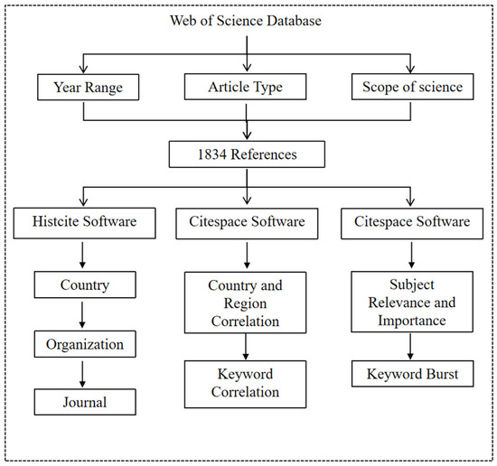 This paper employed various analytical tools (Figure 2), including the built-in analysis tool of the WOS database, CiteSpace literature visualization [31], HistCite citation analysis software [32], VOSviewer [33]. In the application of HistCite [32], the key parameters are the Total Local Citation Score (TLCS) and the Total Global Citation Score (TGCS). CiteSpace and VOSviewer were used to extract important noun phrases from the titles, abstracts, and keywords of the documents for co-word, co-occurrence, and emergent term analysis. This is to identify the research focus and trends regarding the role of soil minerals in organic carbon stability [31]. The analysis in CiteSpace covered the time span from 2013 to 2023, with a time node of one year and the discipline category as the node type. The node strength was set to Cosine by default, the threshold was TOP [25], and Pathfinder and Pruning Sliced Networks in the network pruning function area were selected for conducting the map analysis. VOSviewer was used to analyze countries and keywords, with the data type selected from WOS and the counting method set to Full counting. The keyword parameter threshold was set to 54 to generate the final map. Data analyzed by HistCite, VOSviewer, and CiteSpace were all from the articles downloaded in text format from the WOS database. Please note that this study is based on 1834 documents from the WoS database, potentially omitting relevant studies from other sources (e.g., Scopus, Google Scholar). Future research could integrate multiple databases and apply text mining and NLP to further explore topic evolution and key technological advances.