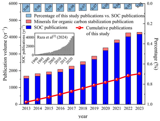 Changes in the number of publications can effectively indicate research intensity in a particular field over a given period, providing great significance for analyzing the development dynamics during that period and predicting future trends [35]. The global atmospheric CO2 concentration surpassed 400 mg/L for the first time in 2013 [36], after which the number of publications concerning the topic of this study showed an approximately linear increase (Figure 3). According to Raza et al. [2], 64% of the 46,080 SOC-related publications were published within the last decade (2014–2023). As shown in Figure 3, publications on the influences of minerals on SOC stability have steadily increased over the past decade. The year 2022 saw the highest number of publications, reaching 232, and by 2023, the cumulative number of publications had reached 1834. Publications in this field accounted for 4–8% of SOC-themed publications in the past decade. Several global initiatives have been launched with discussions on increasing SOC inventories as a potential solution for climate change mitigation, including the “4 pour 1000” initiative (https://4p1000.org, accessed on 7 December 2024), RECSOIL (https://www.fao.org/global-soil-partnership/areas-of-work/recarbonization-of-global-soils, accessed on 7 December 2024), the Koronivia Joint Work on Agriculture (https://www.fao.org/koronivia, accessed on 7 December 2024), the REDD+project (https://www.fao.org/redd/overview/en/, accessed on 7 December 2024), and the European Soil Strategy. These initiatives have effectively promoted research on the role of minerals in stabilizing organic carbon, making the interaction between minerals and SOC an increasingly popular topic in global soil carbon research. Moreover, the growing number of academic achievements in this field indicates a deepening understanding among researchers regarding the effects of minerals on organic carbon stability.