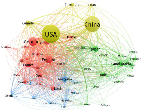 In this study, the VOSviewer visual analysis tool (version 1.6.20) was employed to analyze the collaborative relationships in the field of soil minerals’ impacts on organic carbon stability research between China (including Taiwan) and countries worldwide. Nodes represent keywords. The node size represents the number of occurrences of keywords. The threshold value of keyword parameters is set to 54; that is, keywords appear at least 54 times. Different colors represent different clusters. The size of the circles in the figure indicates the level of activity and the number of articles published by a country or region. In contrast, the distance of connecting lines between countries or regions represents the closeness of their cooperation, with shorter distances indicating closer collaboration. As shown in Figure 5, in this field, countries do not work in isolation—those with higher publication volumes tend to collaborate more closely, reflecting a shared commitment to soil pollution remediation. Figure 5 further illustrates the differences in regional cooperation, showing that China and the United States lead the research in this field. China collaborates more closely with countries in the Asia-Pacific region, whereas the United States has stronger cooperation with Western countries. International collaboration has shown distinct regional characteristics, and future international cooperation and knowledge sharing in this field still need to be further enhanced.