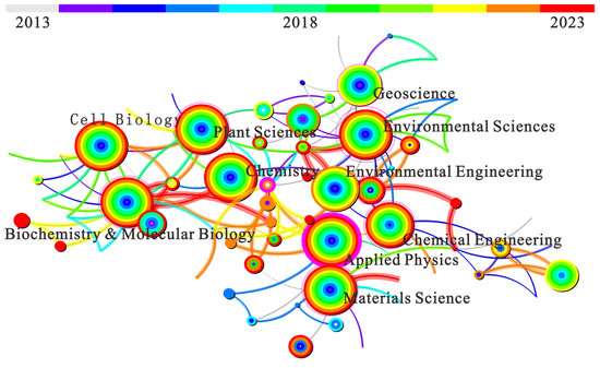 As can be seen from the co-occurrence analysis mapping of the primary disciplines (Figure 6), among the top ten disciplines, aside from Geoscience and Environmental Engineering, the other eight disciplines have larger red outer circles. This reveals that there has been a parallel development across these disciplines and a rapid growth rate in multidisciplinary fields in recent years. Additionally, the dense connecting lines between disciplines indicate that research on the impact of soil minerals on organic carbon stability exhibits characteristics of interdisciplinary integration and close interrelation.