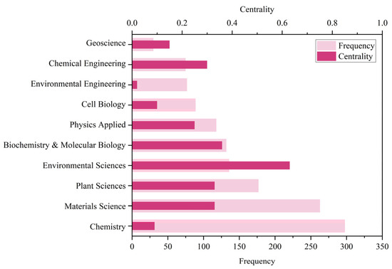 Centrality analysis of disciplines engaged in research on the impacts of soil minerals on organic carbon stability from 2013 to 2023.