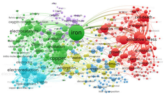 The keyword co-occurrence network model (Figure 8) was constructed using VOSviewer, a literature visualization and analysis software. By analyzing the keywords, researchers can gain insights into current research hotspots and future trends in the field [41]. In VOSviewer, keywords with a frequency of occurrence greater than six were visualized and analyzed. Among these, the keyword with the highest frequency of occurrence was “iron”, appearing 563 times.