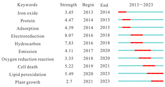 Emergent keywords are terms that appear suddenly and are frequently cited, used for analyzing research frontiers and hotspots over different periods [81]. Specifically, “begin” and “end” denote the start and end of a keyword’s emergence period, respectively, while “strength” signifies the intensity of its emergence; a higher number indicates a more influential keyword [82]. Using the keyword burstiness analysis in CiteSpace software (version 6.3.R1), the detection model in the Control Panel was configured as follows: f(x) = αe(−αx), with α1/α0 = 2.0, The Number of States set to 2, γ[0,1] = 1.0, and Minimum Duration = 2. The top ten most frequently cited keywords were calculated based on this configuration. The keyword emergence analysis of literature on the impact of soil minerals on organic carbon stability is summarized in Figure 9. Among these, keywords such as “Electroreduction”, “Hydrocarbon”, “Lipid peroxidation”, “Cell death”, and “Protein” have shown a higher intensity of emergence after 2013, with values of 8.07, 7.83, 5.49, 5.22, and 4.47, respectively. These values reveal the current research hotspots in this field to a certain extent.
