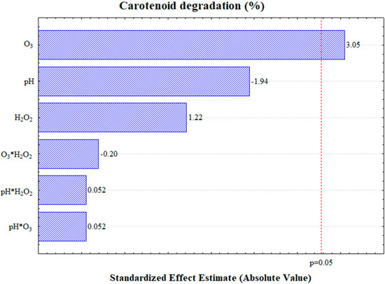 The dependent variable results, derived from the data in Table 2 and Table 3, were analyzed using the analysis of variance (ANOVA) in the StatSoft (v. 7.0) statistical software package. This analysis was performed to identify the most significant independent variables affecting the O3/H2O2 process. Pareto charts were generated to highlight the independent variables influencing carotenoid degradation and the pseudo-first-order kinetic constant, with a confidence level of 95%.