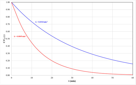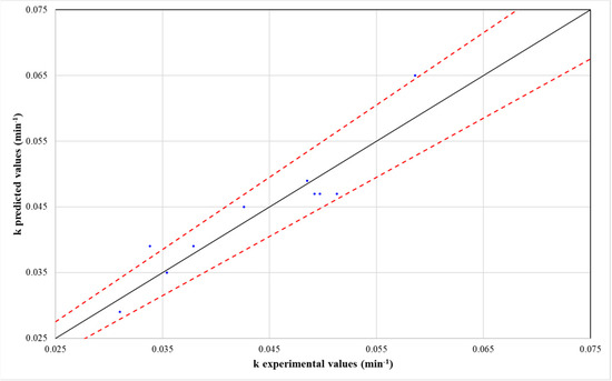 To assess the predictive accuracy of the model, a plot comparing the predicted and experimental k values was constructed (Figure 5). The analysis demonstrated that k, as estimated by Equation (12), exhibited an error of less than 10%. These findings, along with the corresponding R2 values, confirm the model’s suitability for predicting the pseudo-first-order kinetic constant with a high degree of reliability.