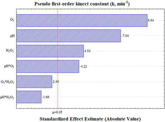 Based on the central point measured in triplicate, the pseudo-first-order kinetic constant exhibited an error margin of 2.2% (Table 3). The analysis of variance (Supplementary Materials) and Pareto chart (Figure 4) demonstrated that all the linear independent variables (pH, O3, and H2O2) were statistically significant at the 95% confidence level. In addition, among the interaction terms, only the interaction between the pH and ozone was found to influence the kinetic constant (k).