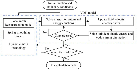 The oil agitation characteristics of the toothless gearbox are solved using the VOF model coupled with dynamic mesh technology, as illustrated in Figure 1. Initially, the initial conditions and boundary conditions are defined to ensure the accuracy of the physical setup in the simulation. Based on the initial mesh, the governing equations and turbulence dynamics equations are solved, and the VOF model is employed to track the two-phase interface [43,44]. Subsequently, the flow-field velocity characteristics are updated, and the turbulence kinetic energy and vortex dissipation are solved. Next, the convergence of the CFD model is assessed. If convergence is not achieved, the governing equations are re-solved; if convergence is achieved, the solution duration is then checked [45,46]. If the target duration is not reached, the mesh is updated using dynamic mesh technology to simulate the rotation process of the toothless gear, and the previous steps are repeated until the desired solution time is met [47,48]. This process enables precise simulation of oil agitation in the toothless gearbox. It allows for the analysis of fluid dynamics, providing a foundation for further optimization and performance enhancement.