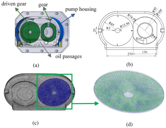 The following steps are involved in the simulation: Import the finite element mesh model into fluid simulation software. Use a user-defined function (UDF) program to set the dynamic behavior of the gear while applying restrictions on the mesh update parameters. Employ a pressure-based solver for the simulation, setting the time step to 2 × 10−5 s and the residual convergence criterion to 1 × 10−5 [56,57,58,59]. After the simulation reaches convergence, analyze the results. For multiphase flow analysis, select the volume-of-fluid (VOF) model combined with the RNG k-ε turbulence model [60,61,62,63,64]. Near the wall, apply the standard wall function. In the solver settings, use the standard SIMPLE algorithm for pressure-velocity coupling, the least squares method for gradient discretization, the PRESTO algorithm for pressure treatment, and the second-order upwind scheme for turbulence kinetic energy [65,66,67].