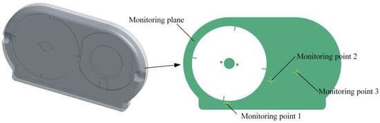 In order to monitor the changes of various parameters inside the oil sump over time, three different monitoring points were set up based on the monitoring surface shown in Figure 4, to grasp the dynamic changes of the flow-field parameters inside the oil sump. Among them, monitoring point 1 is located directly below the oil pan, used to capture the flow-field changes in the area beneath the oil pan. Monitoring point 2 is set at the tangent position of the oil pan, monitoring the parameter changes of the fluid as it leaves the oil pan at that point. Monitoring point 3 is located in the central area on the right side of the oil sump, observing the dynamic flow-field parameters in the central area on the right side of the oil sump. Through the reasonable layout of these three monitoring points, a comprehensive observation of the changes in the flow-field parameters inside the oil sump is achieved, allowing for an in-depth exploration of the evolution patterns of the flow field in the oil sump.