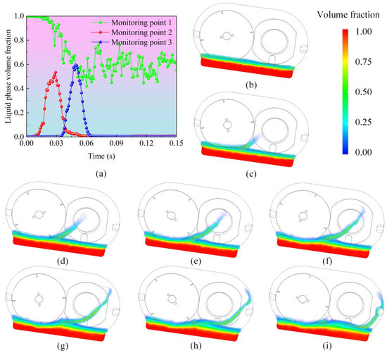 Evolution process of gearbox lubricating oil. (a) Time-varying curves of liquid phase volume parameters at different monitoring points. (b) 0 s. (c) 0.015 s. (d) 0.03 s. (e) 0.045 s. (f) 0.06 s. (g) 0.09 s. (h) 0.12 s. (i) 0.15 s.