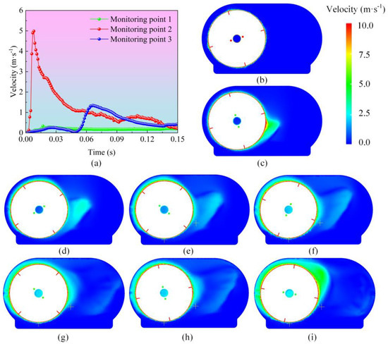 Cloud map of lubrication oil velocity in the gearbox. (a) Time-varying velocity curves at different monitoring points. (b) 0 s. (c) 0.015 s. (d) 0.03 s. (e) 0.045 s. (f) 0.06 s. (g) 0.09 s. (h) 0.12 s. (i) 0.15 s.