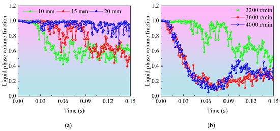 Liquid phase volume fraction under different operating conditions. (a) Liquid phase volume fraction at different oil heights. (b) Liquid phase volume fraction at different stirrer speeds.