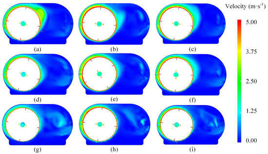 Velocity distribution of the lubricating oil under different operating conditions. (a) n = 3200 r/min, h = 10 mm. (b) n = 3600 r/min, h = 10 mm. (c) n = 4000 r/min, h = 10 mm. (d) n = 3200 r/min, h = 15 mm. (e) n = 3600 r/min, h = 15 mm. (f) n = 4000 r/min, h = 15 mm. (g) n = 3200 r/min, h = 20 mm. (h) n = 3600 r/min, h = 20 mm. (i) n = 4000 r/min, h = 20 mm.