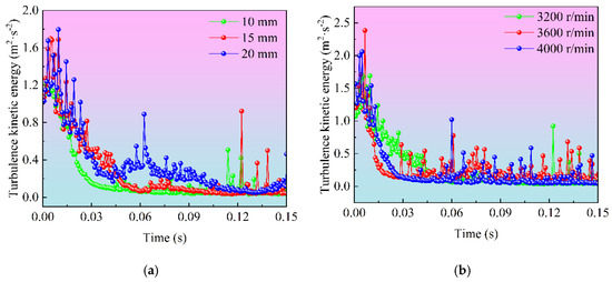 Variation in turbulent kinetic energy under different operating conditions. (a) Turbulent kinetic energy at different oil heights. (b) Turbulent kinetic energy at different agitator speeds.