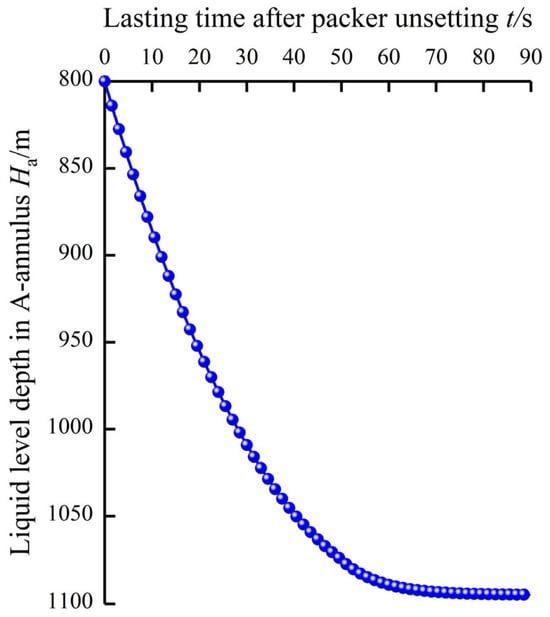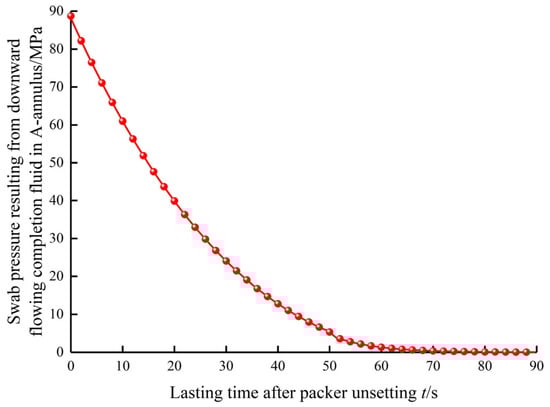 According to Equations (15)–(17), the two key parameters that influence the transient collapse failure of the production casing after packer unsetting are the liquid level depth in the A-annulus and the swab pressure resulting from the downward flowing completion fluid in the A-annulus, which are respectively shown in Figure 4 and Figure 5. It can be clearly observed from Figure 4 that after packer unsetting, the liquid level depth in the A-annulus continued to decrease and the decrease rate gradually diminished. The terminal liquid level depth in the A-annulus decreased from 800 to 1094.75 m at the time of 89.6 s after the packer unsetting. Figure 5 shows similar variation patterns for the swab pressure in the A-annulus, and its largest value of 88.71 MPa occurred at the initial time of packer unsetting.