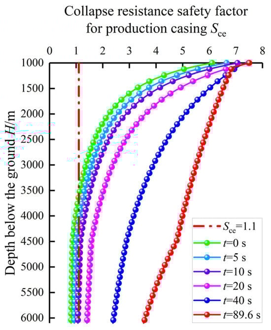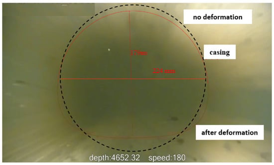 The collapse resistance safety factors for the production casing at different times after packer unsetting were obtained using Equations (15)–(17), which are shown in Figure 6. Because the intermediate casing was set at a depth of 1000 m, the range of the depth below the ground in Figure 6 was considered from 1000 to 6100 m. It can be clearly seen from Figure 6 that the deeper production casing suffered from collapse failure during the initial 10 s after packer unsetting, and the maximum collapse failure well section for the production casing was between 3928 and 6100 m at the initial time after packer unsetting, which corresponded to the field testing results by downhole television of the production casing deformation for well M after packer unsetting, the diameter of the production casing reduced to 179 mm from the initial 224 mm, as shown in Figure 7. This indicated that the swab pressure in the A-annulus resulting from the downward flowing completion fluid after packer unsetting significantly lowered the inner pressure supporting production casing, thus leading to its collapse failure. Consequently, necessary measures should be proposed to avoid this sudden collapse failure of the production casing.