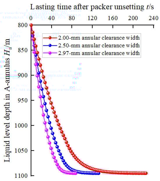 Liquid level depth in A-annulus after packer unsetting with annular clearance widths of 2, 2.5, and 2.97 mm.