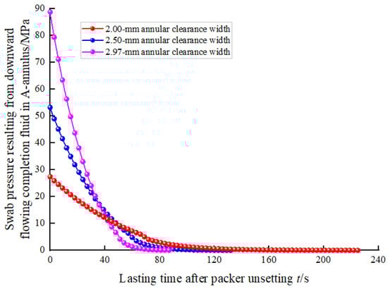 Swab pressure in A-annulus after packer unsetting with annular clearance widths of 2, 2.5, and 2.97 mm.