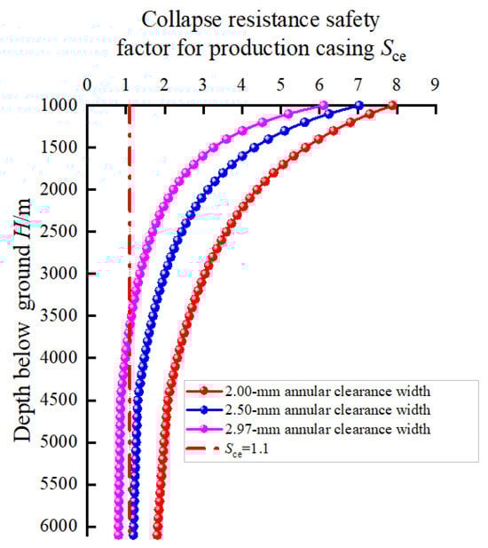 In practice, it is difficult to accurately predict the width of the annular clearance between the packer rubber and the production casing after packer unsetting, which is because the deformation of the packer rubber is a complex viscoelastic mechanical behavior. According to Table 1, supposing the radial deformation of the packer rubber recovered completely after packer unsetting, the width of the annular clearance was 2.97 mm, so three different annular clearance widths of 2, 2.5, and 2.97 mm were selected for sensitivity analysis. After packer unsetting, the liquid level depth in the A-annulus, the swab pressure in the A-annulus, and the collapse resistance safety factor for the production casing with annular clearance widths of 2, 2.5, and 2.97 mm are shown in Figure 8, Figure 9, and Figure 10, respectively. Figure 8 shows that the smaller the width of the annular clearance was, the more time was needed for the liquid level depth in the A-annulus to decrease to reach the final stable value of 1094.75 m. The times were 226.4, 132, and 89.6 s for annular clearance widths of 2, 2.5, and 2.97 mm, respectively. Figure 9 indicates that with the decrease in the annular clearance width, the swab pressure in the A-annulus significantly decreased. When the width of the annular clearance decreased from 2.97 to 2 mm, the maximum swab pressure due to the packer unsetting decreased from 88.71 to 27.4 MPa, a decrease of 69.1%. Figure 10 also shows that a smaller width of the annular clearance was helpful for protecting the production casing during packer unsetting. When the width of annular clearance was 2.97 mm, the collapse resistance safety factors for the production casing were less than 1.1 and may suffer from collapse failure for the well depth between 3610 m and 6100 m. When the width of annular clearance was smaller than 2.5 mm, the collapse resistance safety factors for the production casing were all more than 1.1, indicating the whole production casing will not suffer from collapse failure. In addition, because the aging and plastic deformation of the rubber will occur after a long time in a downhole HPHT environment, the radial deformation of the packer rubber will not be able to recover completely after packer unsetting. Consequently, the packer rubber with a reasonable larger outer diameter and good deformation recovery ability should be recommended for lowering the collapse failure risk of the production casing because of packer unsetting.