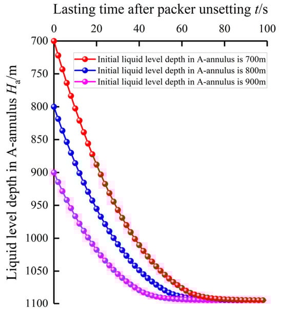 Liquid level depth in A-annulus after packer unsetting with initial liquid level depths in A-annulus of 700, 800, and 900 m.
