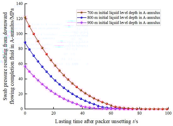 The initial liquid level in the A-annulus after well completion is usually near the wellhead. However, the liquid level in the A-annulus may gradually decrease because of packer leakage. Thus, the initial liquid level depth in the A-annulus during packer unsetting was assumed to be 700, 800, and 900 m for sensitivity analysis. After packer unsetting, the liquid level depth in the A-annulus, the swab pressure in the A-annulus, and the collapse resistance safety factor for the production casing under three different initial liquid level depths in the A-annulus are shown in Figure 11, Figure 12, and Figure 13, respectively.