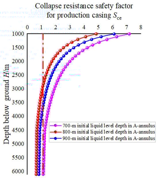 Figure 11 shows that the smaller the initial liquid level depth in the A-annulus was, the more time was needed for the liquid level depth in the A-annulus to decrease to the terminal stable value of 1094.75 m. The required times were 99.3, 89.6, and 77.7 s for initial liquid level depths of 700, 800, and 900 m, respectively. Figure 12 indicates that with the increase in the initial liquid level depth in the A-annulus, the swab pressure in the A-annulus significantly decreased. When the initial liquid level depth in the A-annulus increased from 700 to 900 m, the maximum swab pressure due to packer unsetting decreased from 122 to 57.05 MPa, a decrease of 53.2%. Figure 13 also shows that a larger initial liquid level depth in the A-annulus was beneficial for protecting the production casing during packer unsetting. When the initial liquid level depth in the A-annulus was 700 m, the collapse resistance safety factors for the production casing were less than 1.1 and may have suffered from collapse failure for the well depth between 2869 m and 6100 m. When the initial liquid level depth in the A-annulus was 800 m, the collapse resistance safety factors for the production casing were less than 1.1 and may suffer from collapse failure for the well depth between 3610 m and 6100 m. When the initial liquid level depth in the A-annulus was larger than 900 m, the collapse resistance safety factors for the production casing were all more than 1.1, which indicating the whole production casing will not suffer from collapse failure. Consequently, to lower the collapse failure risk of the production casing due to packer unsetting, the initial liquid level depth in the A-annulus should be controlled reasonably before packer unsetting.
