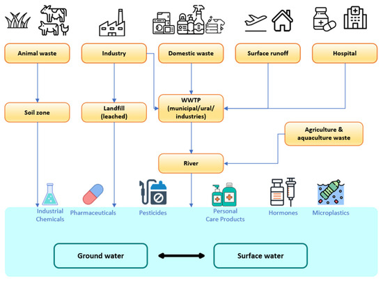 Micropollutants enter the environment through a variety of sources, including industrial emissions (via air and effluents), domestic and hospital waste, livestock, and leachates from landfills, as shown in Figure 2. Among these sources, household wastewater is particularly significant in introducing micropollutants into surface waters, making aquatic environments the primary receptor of these pollutants [78].