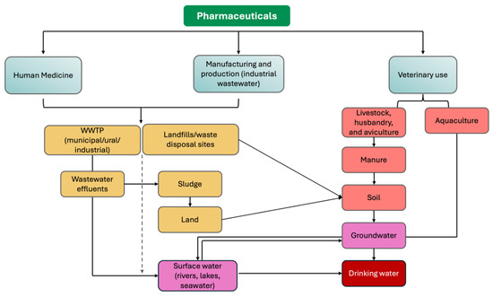 About 70% of the pharmaceuticals in the wastewater originates from households, 20% comes from livestock farming, 5% is from hospital effluent, and the remaining 5% comes from runoff from non-point sources [87]. Sewage containing pharmaceutical pollutants is treated in WWTPs. After treatment in communal or industrial WWTPs, the resulting water is generally discharged into water bodies. However, due to their chemical stability, resistance to biodegradation, and ability to pass through filtration processes based on size, charge, or solubility, pharmaceuticals and other pollutants are often not completely removed in conventional treatment plants. Consequently, these contaminants can find their way into surface and groundwater [88]. Additionally, smaller quantities enter the sewer system through manufacturing processes or improper disposal via sinks and toilets. As a result, these active substances can ultimately contaminate drinking water through bank filtration or surface water contamination (Figure 3) [89,90].