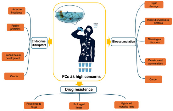 Micropollutants, even at very low concentrations in water bodies, can have long-term (chronic) effects on both human health and ecosystems. Organic micropollutants, such as pharmaceuticals, pesticides, and microplastics, can disrupt aquatic ecosystems and pose risks to human health when consumed through contaminated water or food. These micropollutants contribute to issues, such as antibiotic resistance, endocrine disruption, cancer risks, and environmental degradation. They can bioaccumulate in the food chain, leading to persistent damage to ecosystems, while chronic human exposure may result in serious health complications (Figure 4) [121].
