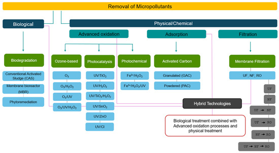 - Asheghmoalla, M.; Mehrvar, M. Integrated and Hybrid Processes for the Treatment of Actual Wastewaters Containing Micropollutants: A Review on Recent Advances. Processes 2024, 12, 339. [Google Scholar] [CrossRef]
