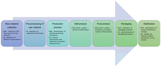 The flowchart of a general food production process with examples of application of experimental design (DoE) and artificial intelligence (AI) approaches in each production phase.