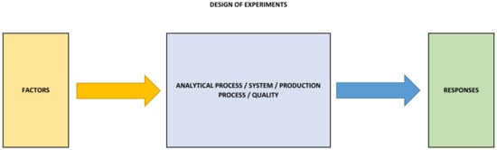 In addition to AI, experimental design (or design of experiments—DoE) has become an indispensable part not only of laboratory analytics, but also at the level of industrial production. DoE has a significant application in the development and optimization of industrial processes (in pharmaceutical technology [], calibration of car engines [], in the electronic industry [], extraction of biologically active compounds [], waste treatment [], etc.). Experimental design involves defining a standard reference experiment against which new representative experiments are performed symmetrically with respect to the standard reference experiment []. The integration of AI and DoE in food engineering is illustrated in Figure 1.
