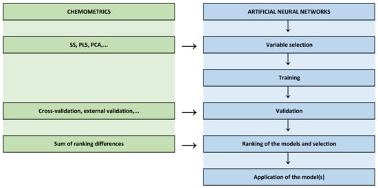 Considering regression modeling, it can be noted that in the published studies, there are various regression approaches used together with artificial intelligence. The influence of chemometrics in regression modeling using artificial intelligence is reflected in the selection of appropriate variables that may be significant for modeling, validation procedures and the calculation of important statistical parameters, as well as the ranking and selection of suitable models. In some novel studies, there is a lack of thorough model validation, including the absence of external validation as a true confirmation of model applicability. In the case of defining a larger number of models, it would be beneficial to conduct a chemometric analysis for ranking predictive models. Figure 4 illustrates the moments in ANN modeling where the integration of chemometrics and ANN modeling occurs to obtain high-quality and reliable ANN models.