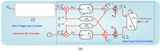 where , and represent the converter side voltages; is DC link voltage; and , and are the switching signals of the SPWM inverter. Thus, the differential equation of the DC/AC converter to grid can be explained in terms of the voltage and current of an LCL filter, as given by Equations (15)–(17), as follows.