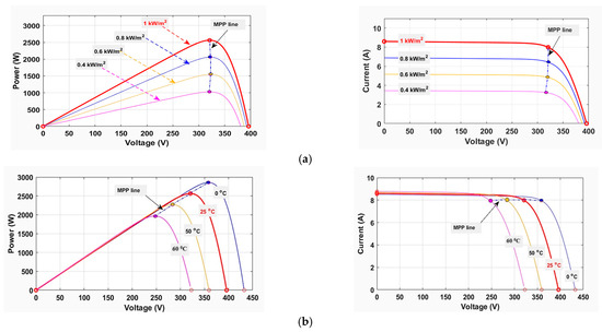 As stated, the general routine of the standard radiation and temperature in research are 1000 W/m2 and 25 °C. The characteristics of the solar PV module are based on the occupationally available Kyocera solar KD320GX-LPB chosen to be used in the MATLAB Simulink model and have been presented [20]. The electric parameters of the PV array are given in detail in Table 1. The P-V and I-V characteristics of the PV module depend on various meteorological conditions, such as a temperature (STC = 0 °C to 60 °C) and irradiance ( = 400 W/m2 to 1000 W/m2), as shown in Figure 3a,b.