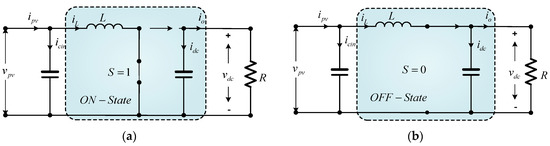 A boost converter is a power electronics device that converts the value of the average voltage and current from a controlled low input to a high output by changing the duty cycle “D” at a higher switching, which has been discussed in [21,22,23,24]. This converter is one of the most crucial non-isolated step-up converters and is often used in linearized photovoltaic systems for tracking the MPP generated by a PV array. In this work, the MPP is tracked through the LMPO algorithm, which computes the MPPT reference voltage that is controlled by a PI controller scheme [25]. Figure 1 depicts the overall configuration of the DC-DC converter interconnected into a PV array. An equivalent circuit diagram of the power boost converter for both turn-on and turn-off switching mode operations in continuous conditions is shown in Figure 4. All components used in the proposed system are ideal since there is no internal resistance in the circuit and no energy is required by the components of the circuit.