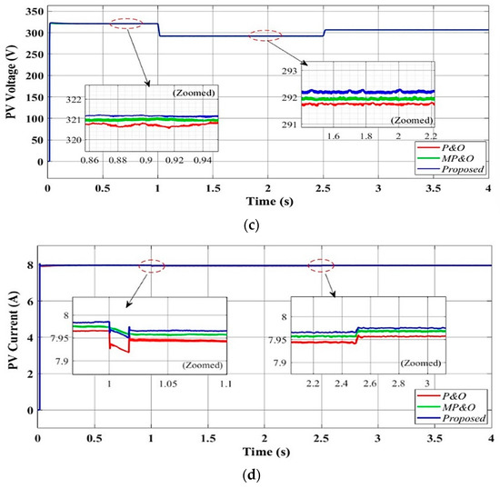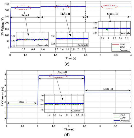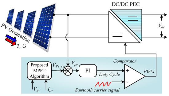 where is the real duty cycle, = the earlier value of the real duty cycle at the sampling time, and = the variable power steps and stepping factor in refs. [17,18,19]. The variable step size can be expressed as a function of the varying voltage and power, as given in Equations (40)–(42):
