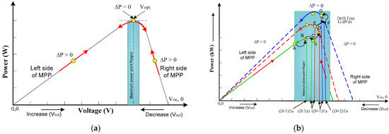 (a) P-V curve of existing MPPT control technique and (b) proposed adaptive variable step-size LMPO MPPT with solar PV irradiance enhancement.