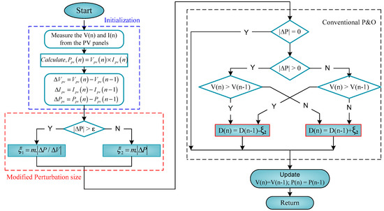 A flowchart of the conventional PO and modified PO MPPT tracking algorithms is shown in Figure 9. This is the most popular technique for the industrial sector because it is simple, low-cost, requires minimal sensors, and operates directly [9]. The simple operation of the conventional controller changes the PV voltages in a similar direction at . Otherwise, the MPPT control technique inverts the PV voltage efficient variable step size in the direction of the maximum power point, which is represented in Figure 10a. However, conventional PO MPPT changes the location of the system operating point by varying the PV array’s operating voltage by a voltage increment (), which changes the PV array’s output power by a voltage increment (). The oscillations’ amplitude around the MPP depends on the variable step size used. A performance analysis of the P&O and MPO control techniques of MPP with efficient small and large voltage step sizes can be conducted [10,11,12,13,14,15,16,17]. The conventional MPPTs offer advantages but suffer from several drawbacks. In the modified PO, the perturbation cycle takes into account the variable step size rather than the fixed step size as shown in in Figure 10b. The expansive oscillations around the MPP will cause a loss of productive power if the step size is kept large to accomplish a fast dynamic response. Therefore, a modified PO technique to overcome these drawbacks is presented [18]. However, the main issues of this MPPT method include steady-state oscillations, a large step size, and a slow tracking response at the maximum power point. This makes it less suitable for changing climatic conditions when employing the largest perturbation step size. Therefore, the MPP is quickly achieved but power losses are caused by increased steady-state oscillations. Although the power loss caused by the steady-state perturbation can be reduced by a smaller perturbation step, the tracking speed will be slower.