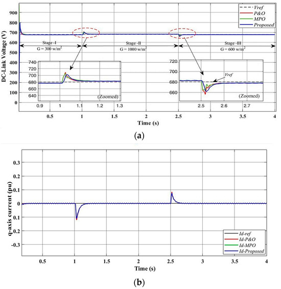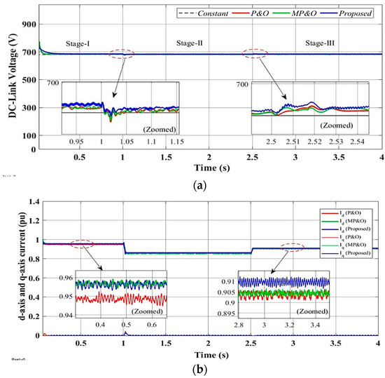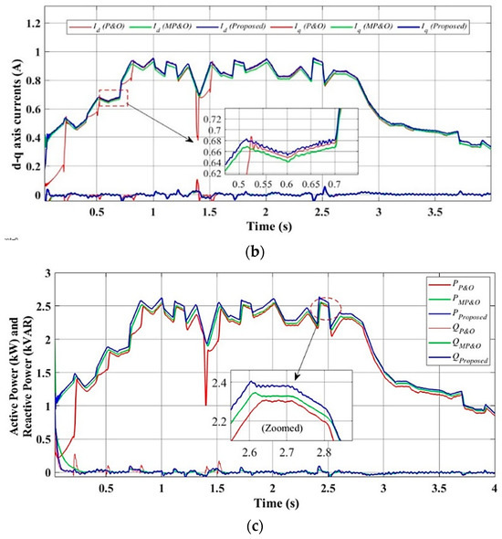 Grid-side simulated results performance analysis of proposed control technique in Scenario III: (a) DC link voltage, (b) d-q-axis current (), and (c) active power, (kW) and reactive power (kVAR).