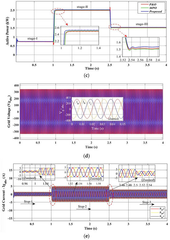 The dynamic behavior of the proposed MPPT control technique is evaluated under sudden changing irradiance and a fixed temperature (25 °C) using one-day real-time irradiance data samples. The one-day real-time values were collected from the weather station, which were collected using the sensor at a sample rate of 60 s and stored in the database at intervals of 60 s. In Figure 16a, sudden changes in irradiance on a special day at the beginning of June 2023 are illustrated. To simulate the sudden shift in irradiance, 40 irradiance data samples are gathered at regular intervals between 11:30 a.m. and 12:30 p.m. Therefore, the collected data are presented as a step input, with changes occurring every 0.1 s. A comparison of the solar PV-side output power harvested results, validated by employing the conventional and proposed tracking control techniques, is shown in Figure 16b. It can be observed that the proposed LMPO-MPPT technique accurately tracks the MPP under varying meteorological conditions and provides a fast-tracking response with a lower ripple output power as compared to the conventional techniques. Furthermore, the GSC under the proposed and conventional control techniques in Scenario III are shown in Figure 17a–c, respectively. It is expected that the findings will be collected once the system is synchronized with the utility grid. The DC link reference voltage is successfully regulated at approximately Vdc = 680 V, as shown in Figure 17a. In addition, the grid current components on the d-axis and q-axis also follow their reference values, as presented in Figure 17b. To achieve the unity power factor operation, the q-axis current is regulated to zero (injecting only the true power). The parameters of the tracking responses, efficiency, error, and THD% of the GIPV system in different scenarios are shown in Table 4. In Figure 17c, it is apparent that no reactive power is being added to the grid while the active power varies in response to the PV array’s output, as shown in the zoomed view. Using the proposed control technique improves both the grid-side and PV-side results in terms of their ripple output power, fast tracking, improved efficiency, and response settling time, respectively.