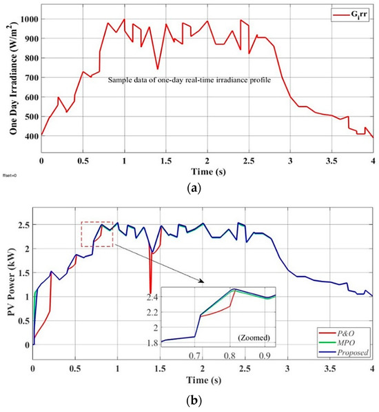 PV-side simulated results performance of proposed control technique in Scenario III: (a) one-day real-time irradiance profile and (b) PV output power, .