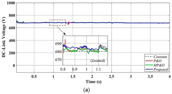 The proposed control technique has been examined for its transient response to DC link voltage regulation [4]. The influence of dynamic and transient voltage ripple response on the DC side has been investigated in terms of the total harmonic distortion [20,21,22] present in the output current at the grid side under different scenarios. Scenario I is discussed in Section 4.1, where the system starts with step changes (from 300 W/m2 to 1000 W/m2 and from 1000 W/m2 to 600 W/m2). The proposed control technique provides a DC link voltage of approximately 680 V under steady-state conditions, with an initial overshoot of 20.18% and a response settling time (trs) of 0.35 s for the simulated results of Vdc performance, as shown in Figure 12. The harmonic spectra of the supply current and load currents are displayed in Figure 18. The total harmonic distortion (THD) of the grid current is 2.60%, and the load current THD is 15.56%. The performance matrices of tracking responses, efficiency, %error, and THD% of the GIPV system were studied in different scenarios.