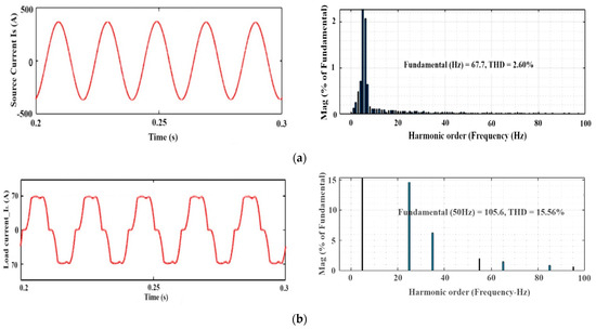 Simulated results in steady state in Scenario I: (a) THD spectrum for grid current phase ‘a’ and (b) harmonic load current phase ‘a’.