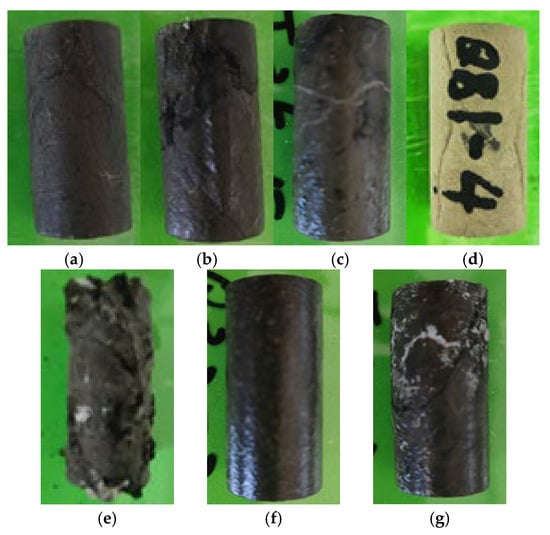 The cores after the experiment on the acid–rock reaction rate of gelled acid. (a) C-1; (b) C-2; (c) C-3; (d) C-4; (e) C-5; (f) D-1; and (g) D-2.